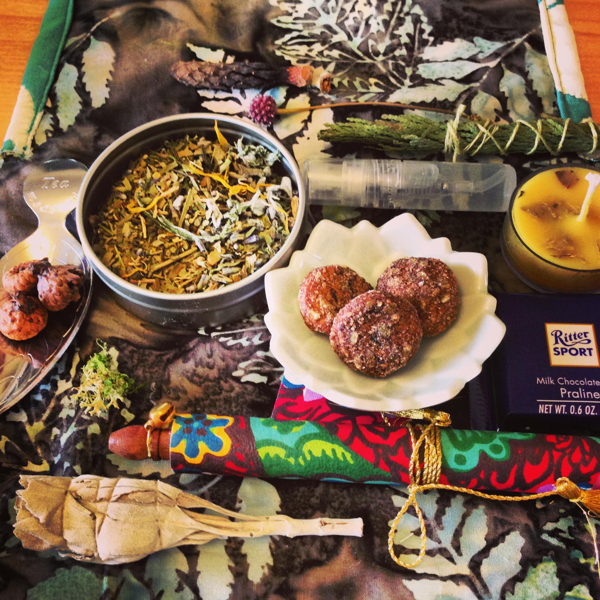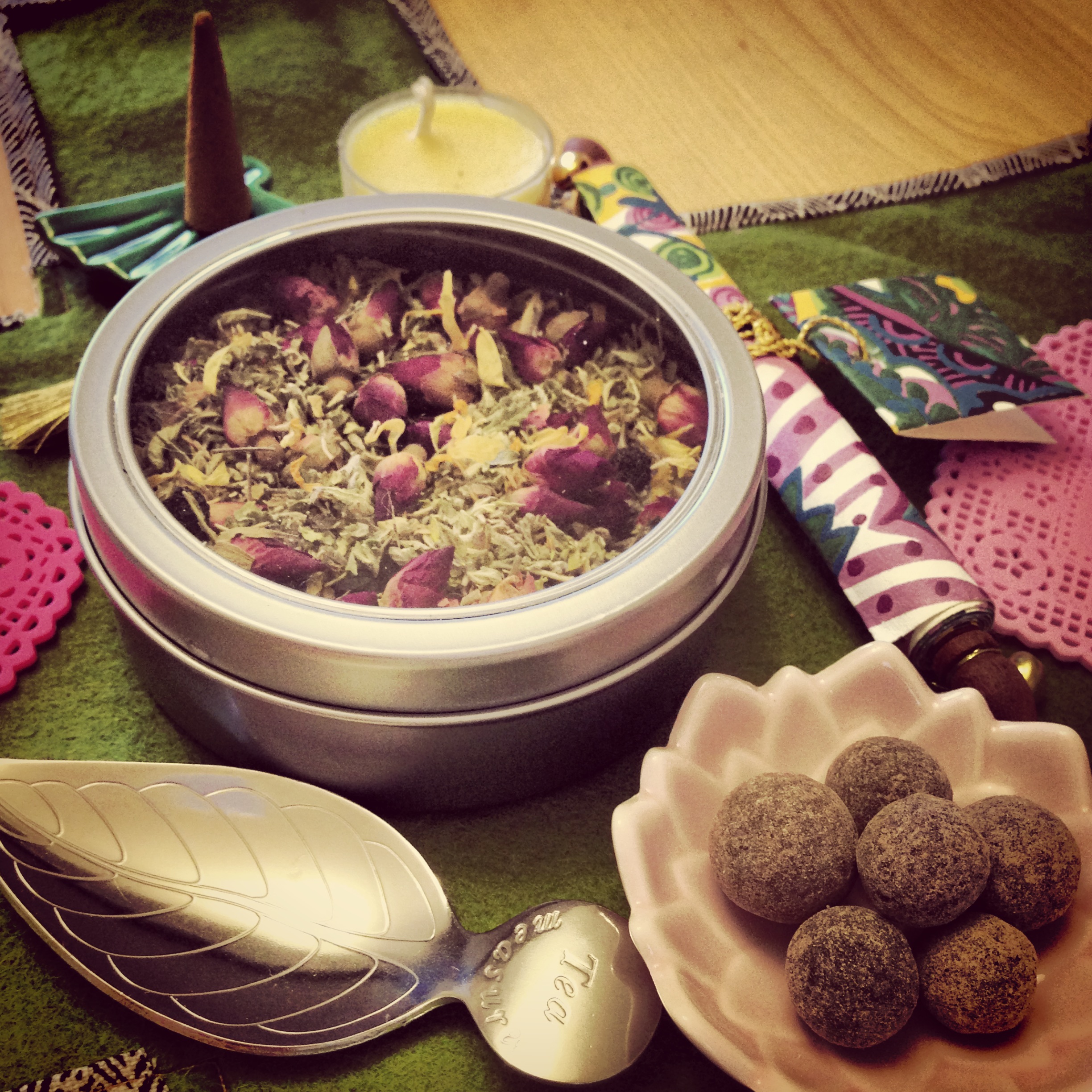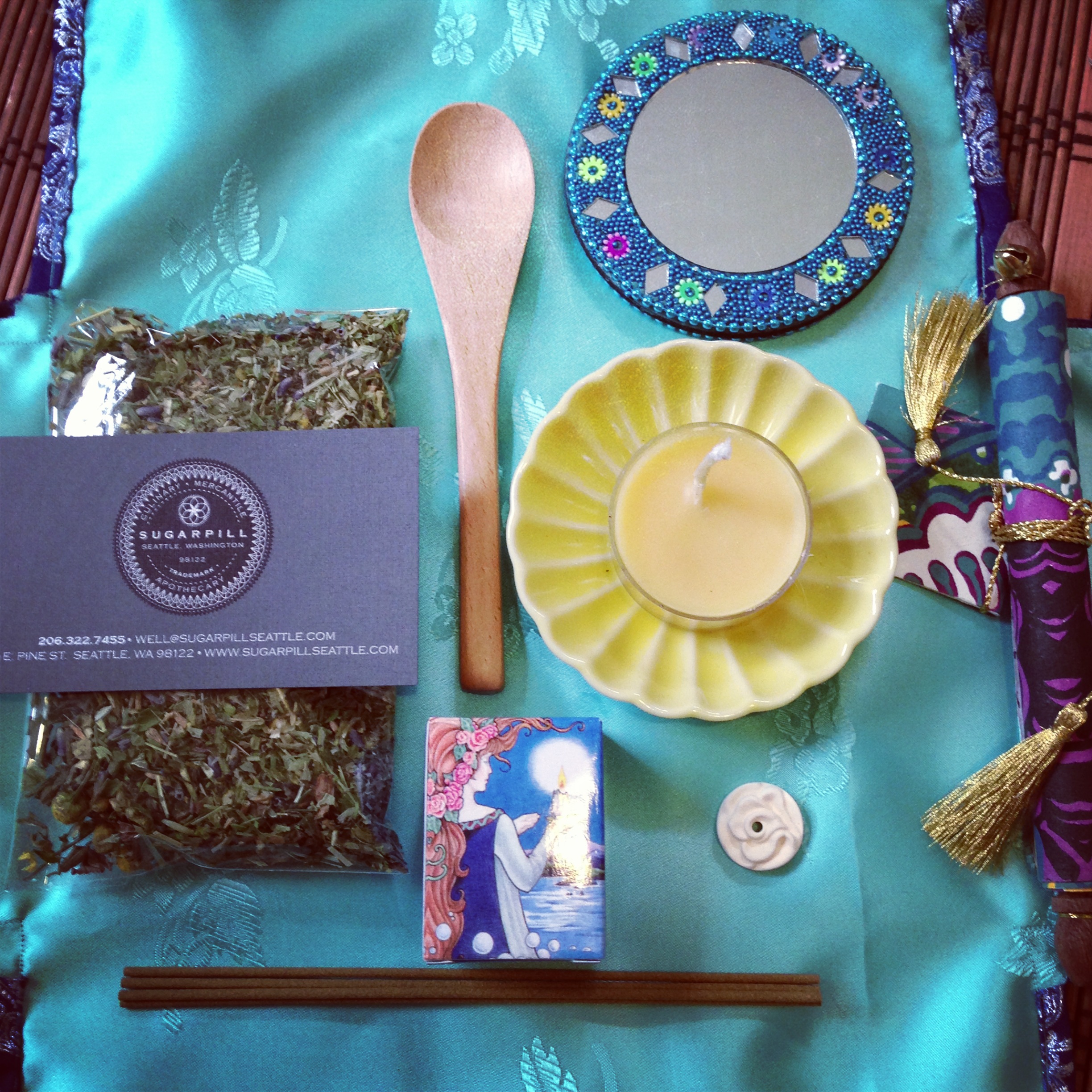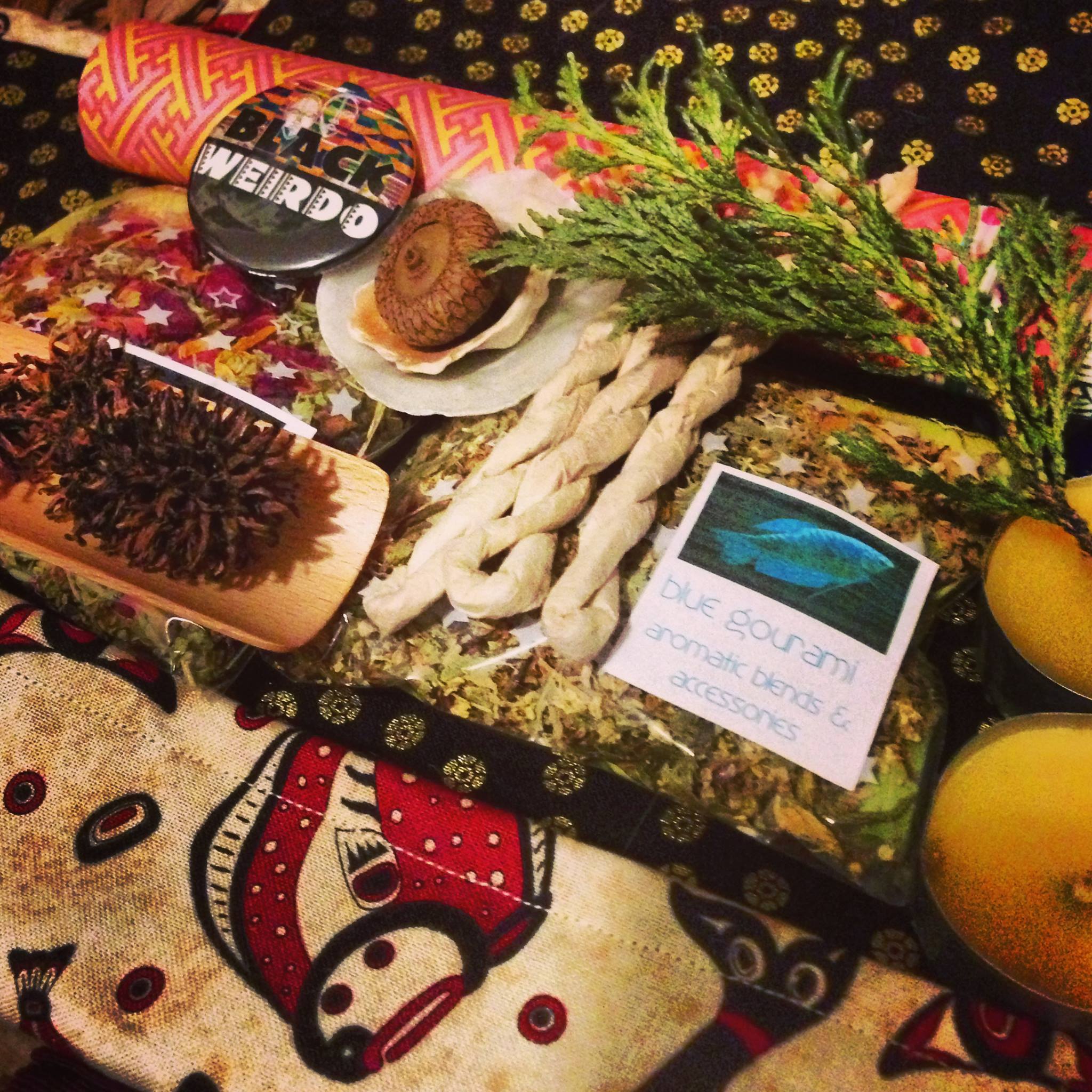 These folding fabric pouches contain hand blended herbal tisanes and teas, an array of body care elements and carefully chosen objects. House warming, seasonal change, creative focus, and new mother have been some of the occasion themed kits. Specialty gift kits have included Tarot, Twin Peaks, and Alice in Wonderland. Custom Blue Gourami kits were made for guests of various Miko Kuro's Midnight Tea gatherings to interact with in the company of others as well. Whether you are looking for a gift for an occasion, transition, specialty interest, or an interactive event, Blue Gourami is here to help!Please visit my Etsy shop here to view listed available kits, or to contact Blue Gourami to request a made to order piece.